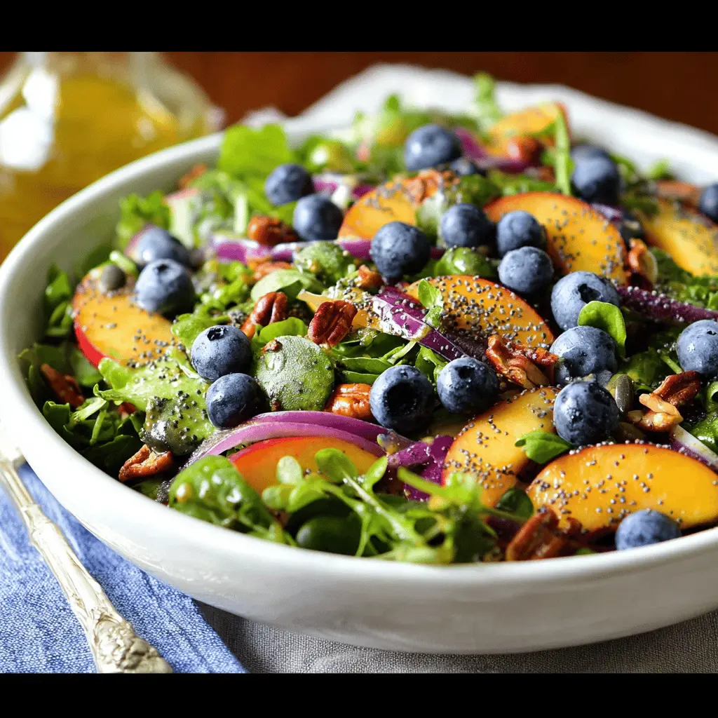 A light and refreshing salad perfect for summer gatherings, featuring fresh blueberries and peaches with a delightful poppy seed dressing.