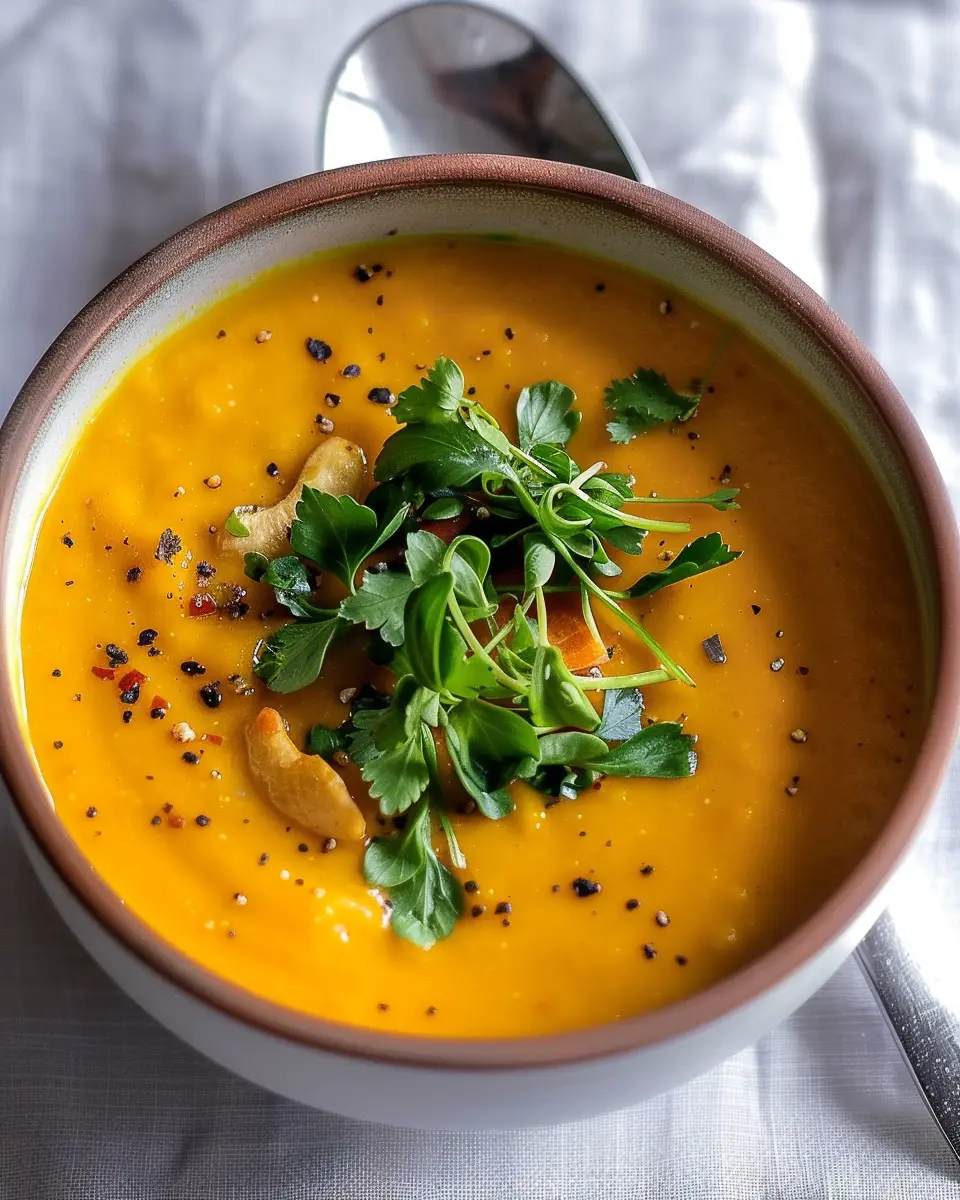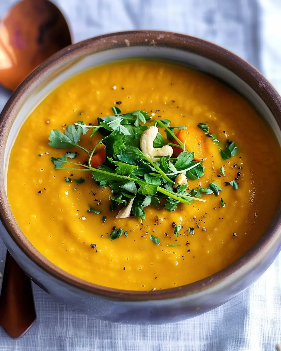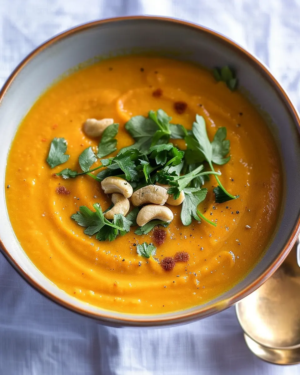 Discover the delicious and healthy recipe for Cashew Carrot Ginger Soup, perfect for a comforting meal.