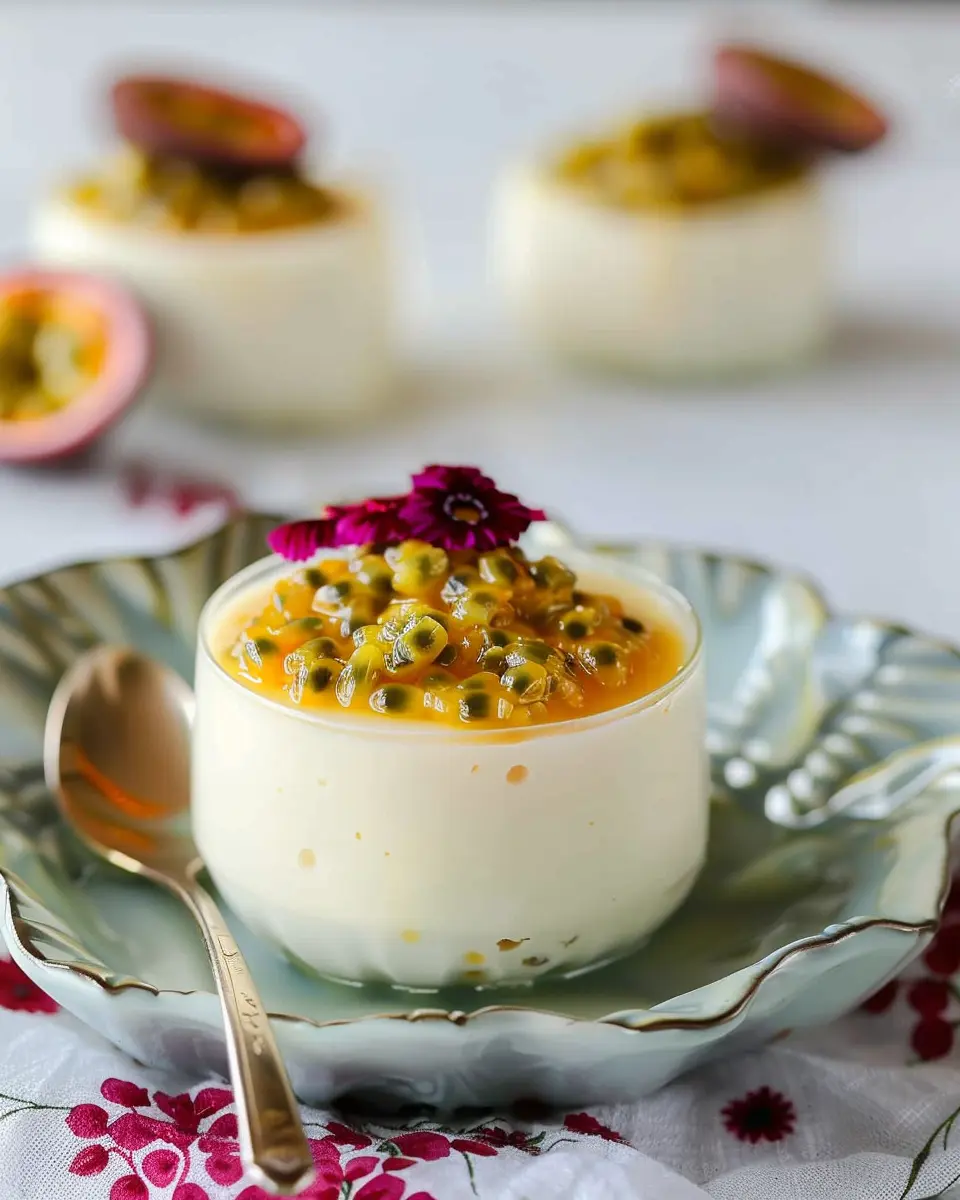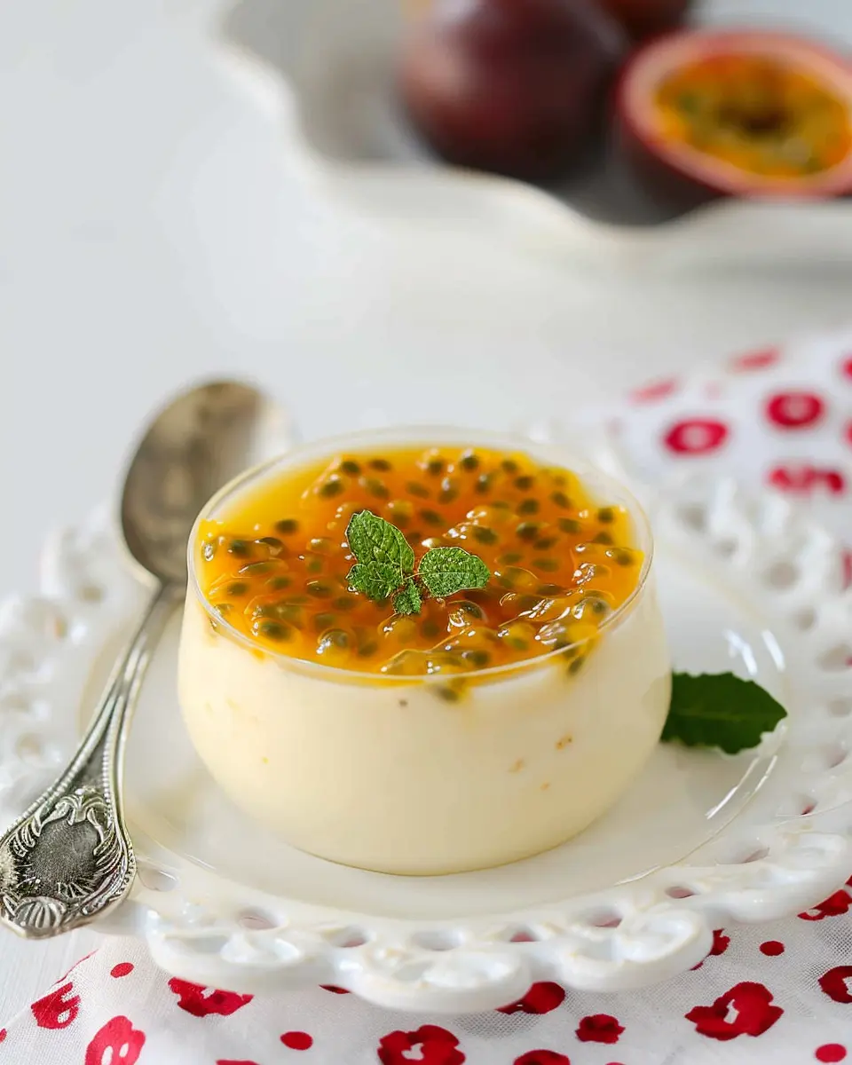 A creamy coconut panna cotta topped with tangy passion fruit glaze, perfect for any occasion.