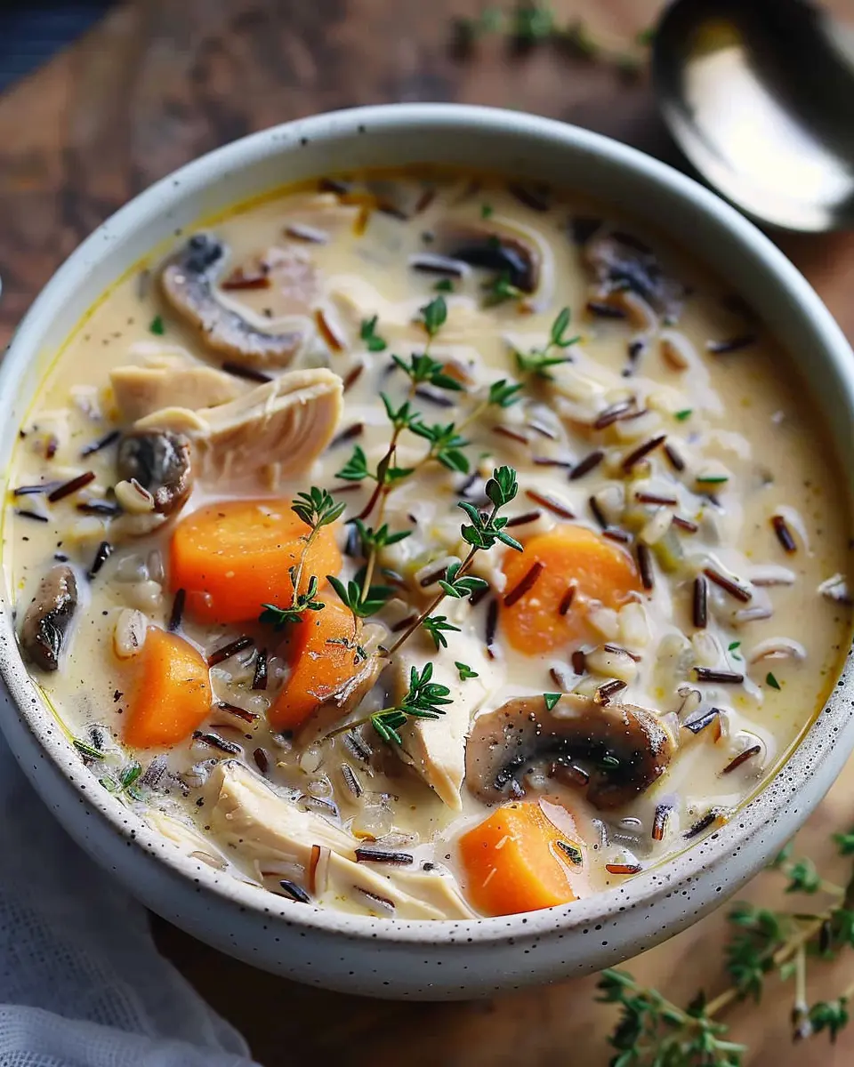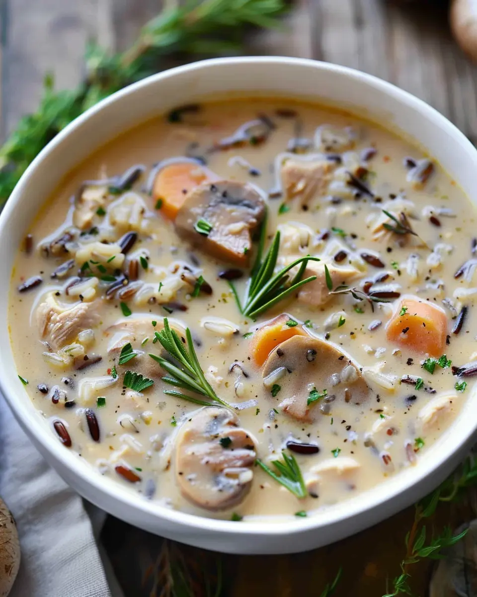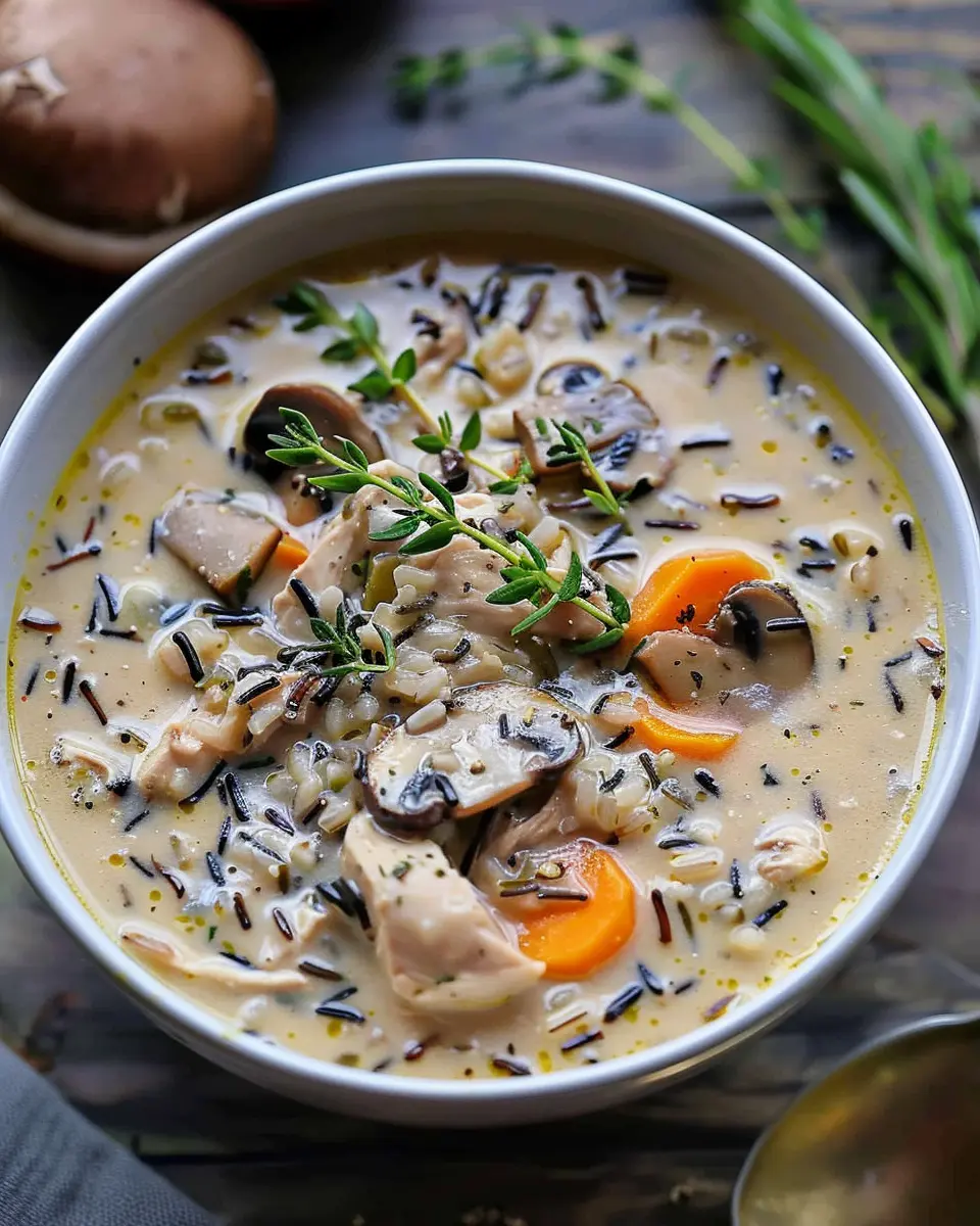 Indulge in a warm bowl of creamy mushroom chicken and wild rice soup, perfect for chilly days!