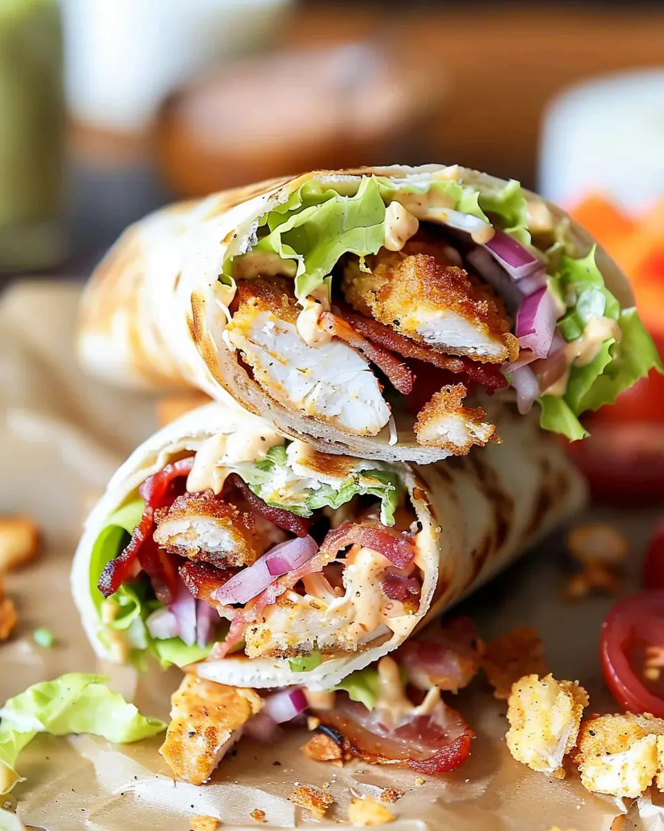 A delicious wrap filled with crispy chicken, bacon, and ranch flavors, perfect for a quick meal.