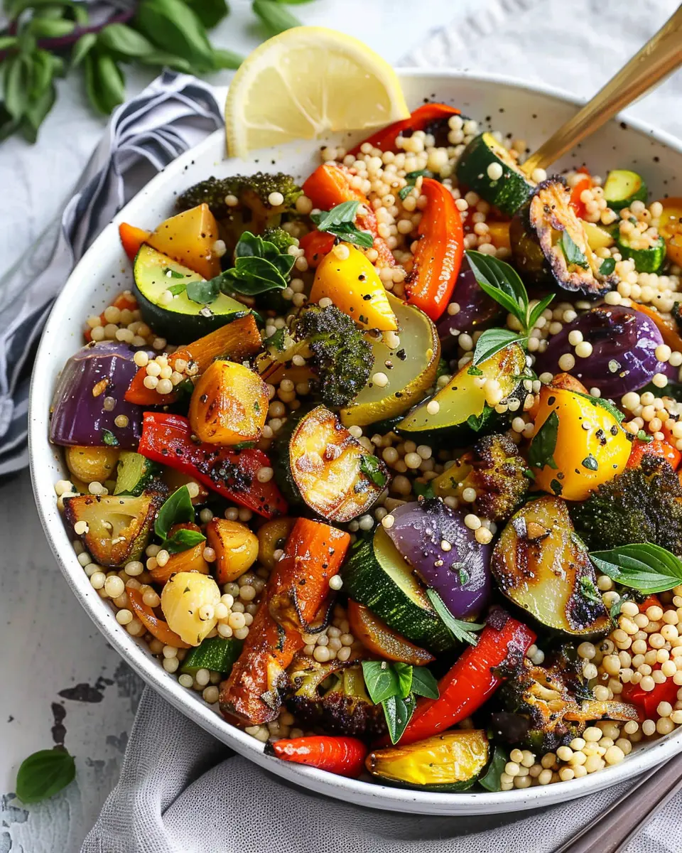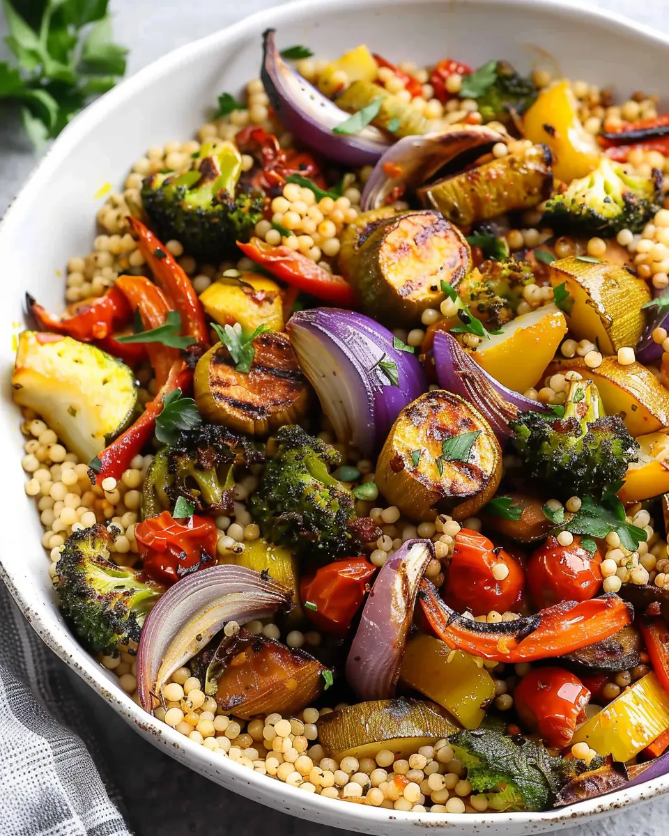 Delicious and easy to make, this roasted vegetable couscous is a perfect comfort food. Enjoy the blend of flavors with every bite.