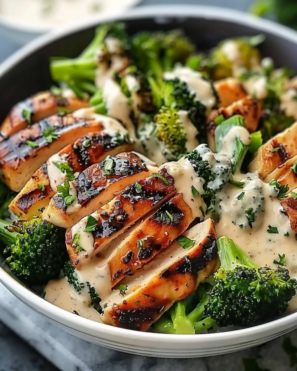 Keywords: Grilled Chicken, Broccoli, Creamy Garlic Sauce, Healthy Recipe