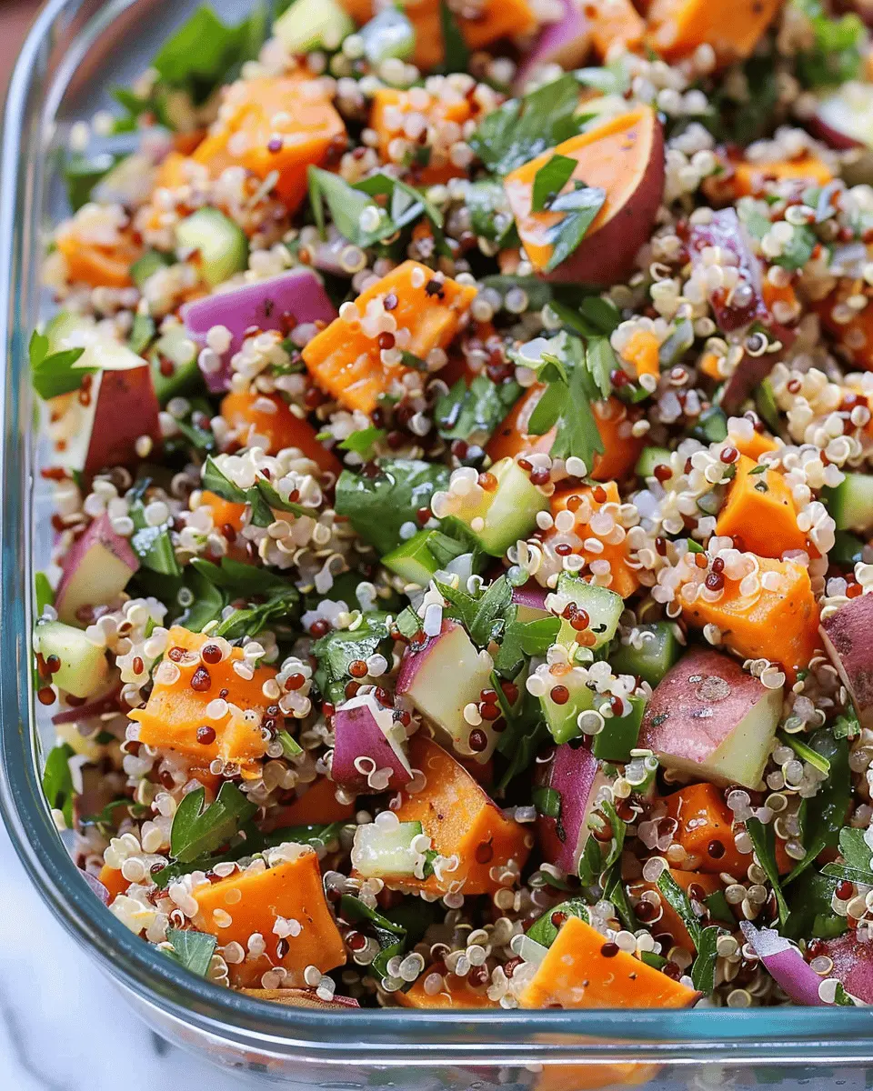 In conclusion, this Loaded Quinoa and Sweet Potato Salad is not just a dish; it’s a nourishing experience packed with flavor and nutrition. With wholesome ingredients like quinoa, sweet potatoes, and a variety of colorful veggies, it’s a powerhouse of vitamins and minerals. It’s perfect for meal prep or a quick lunch, keeping you satisfied and energized throughout your busy day.
