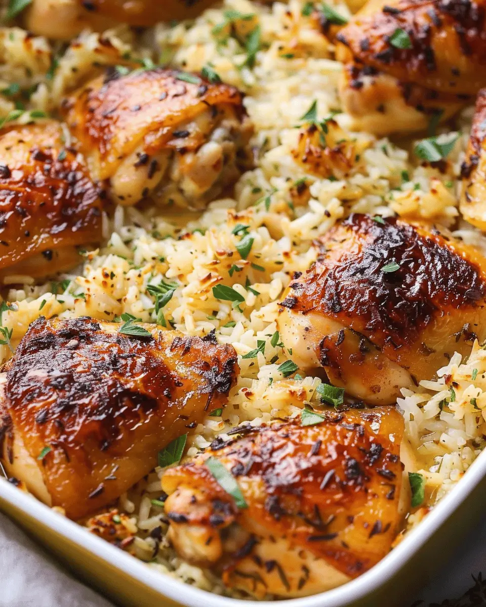 Once your one-pan chicken and rice bake is out of the oven, it’s crucial to let it rest for about 5–10 minutes. This allows the flavors to settle and ensures the rice will be perfectly fluffy. After resting, gently fluff the rice with a fork before serving.