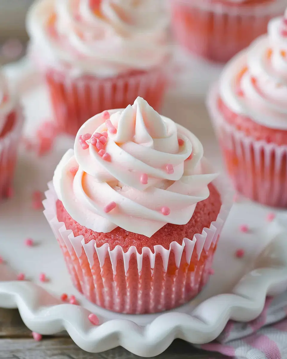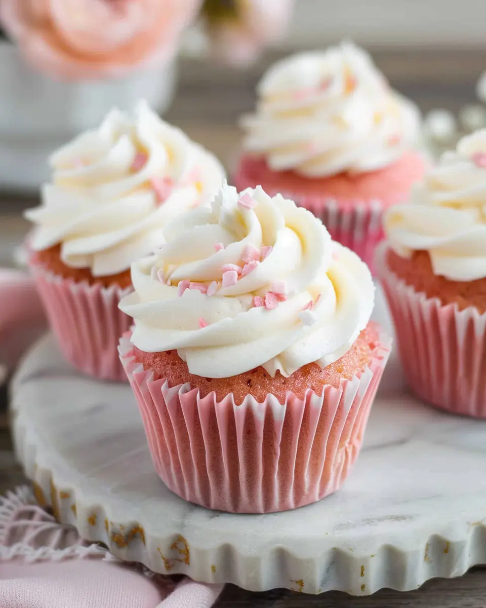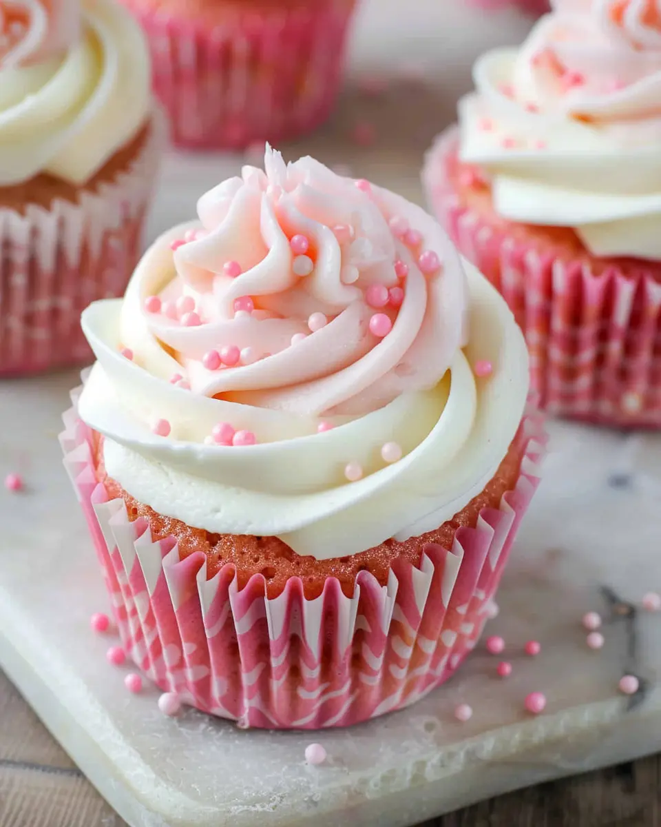 Indulge in these decadent pink velvet cupcakes topped with a rich vanilla buttercream frosting.