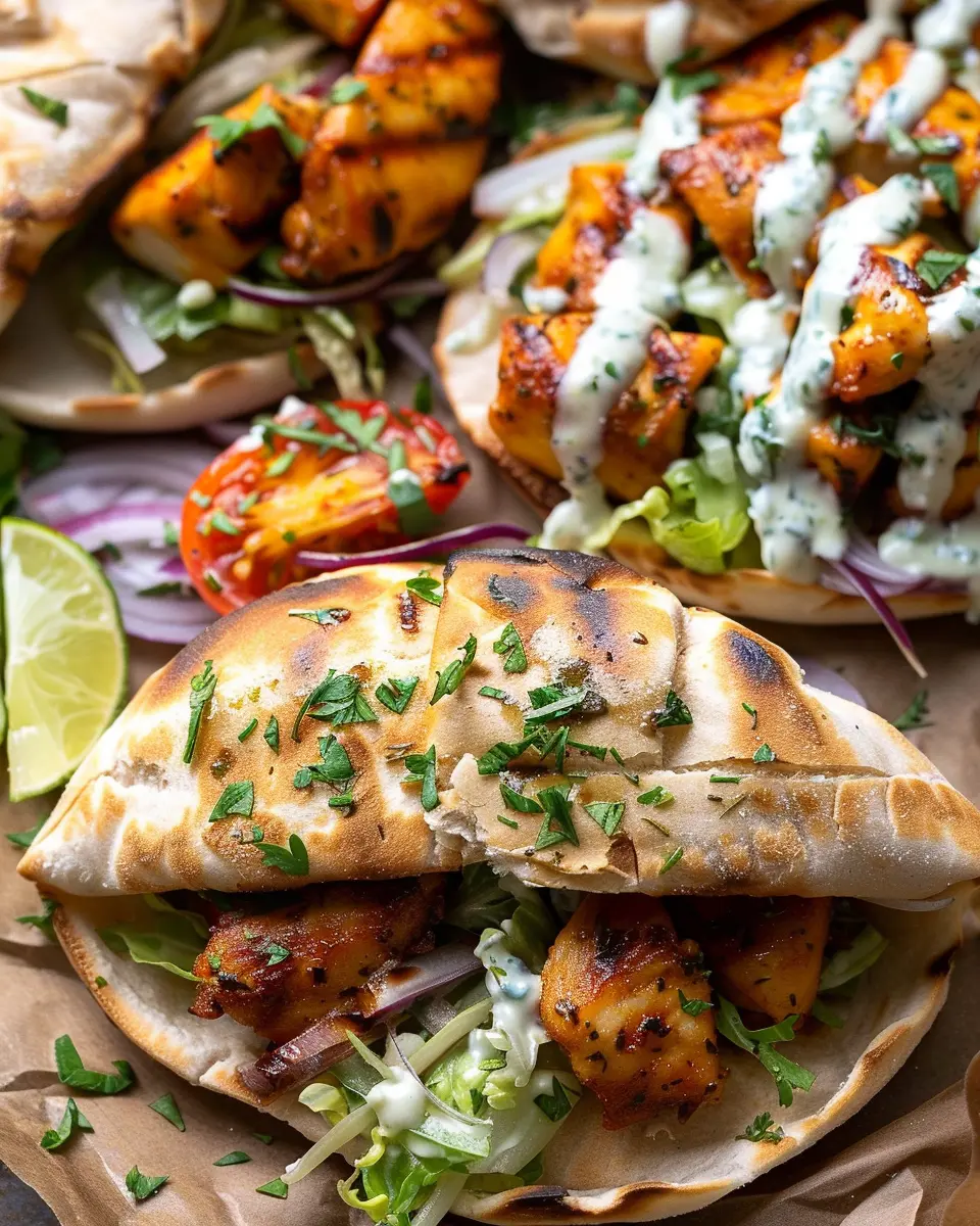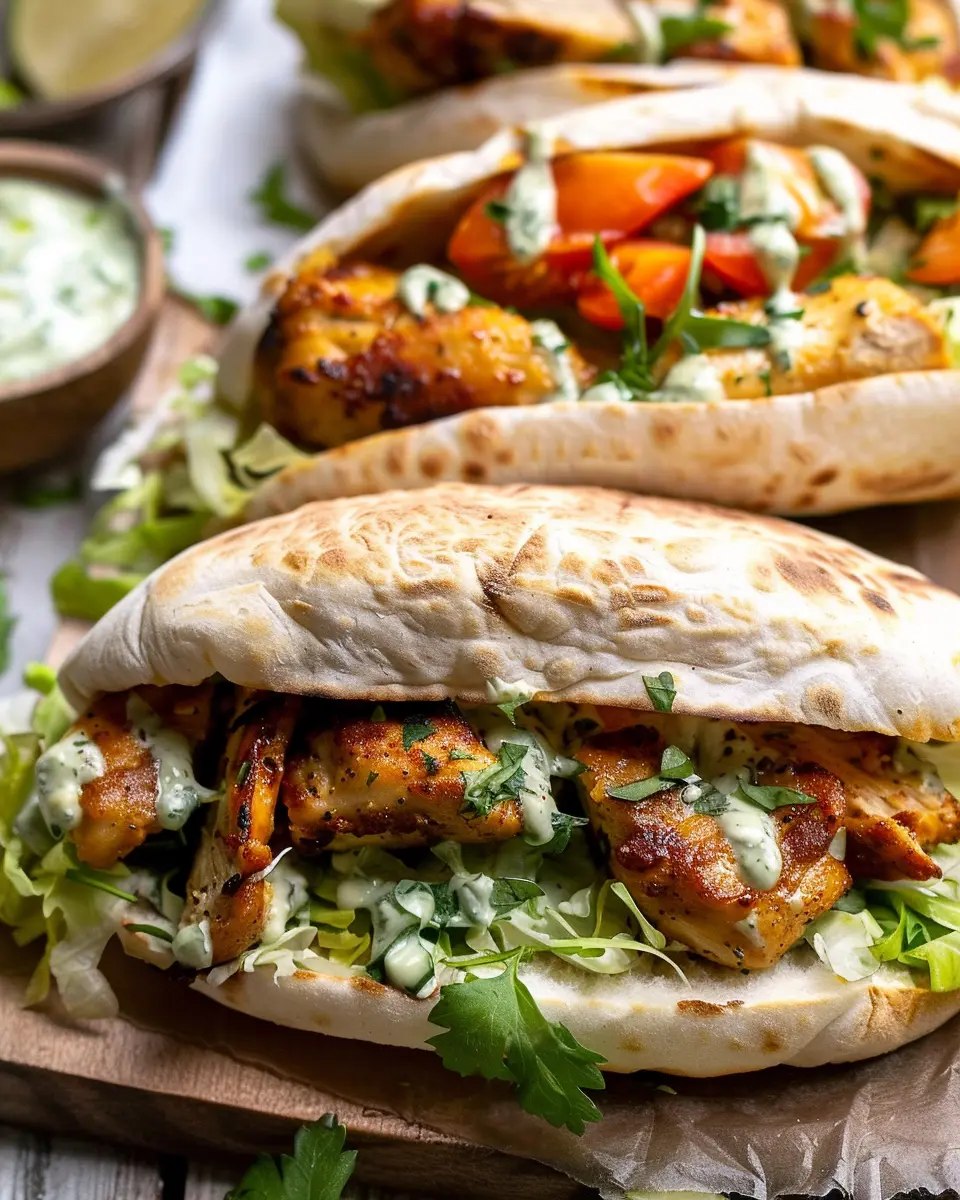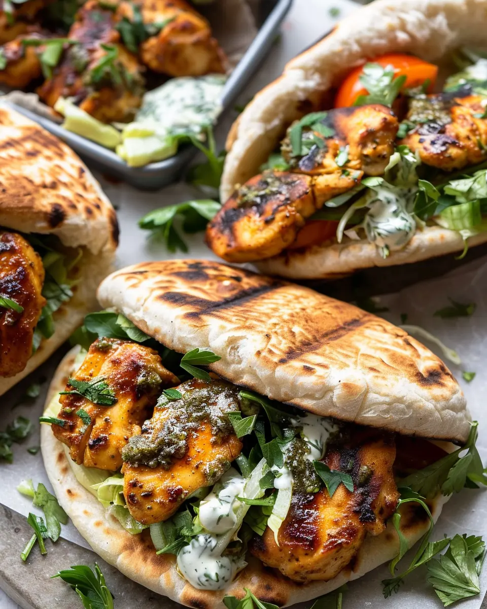 As your chicken finishes baking, get ready to warm those pitas. You can do this in the oven for a couple of minutes or even on a stovetop skillet for a bit of char. Once warmed, it’s assembly time!