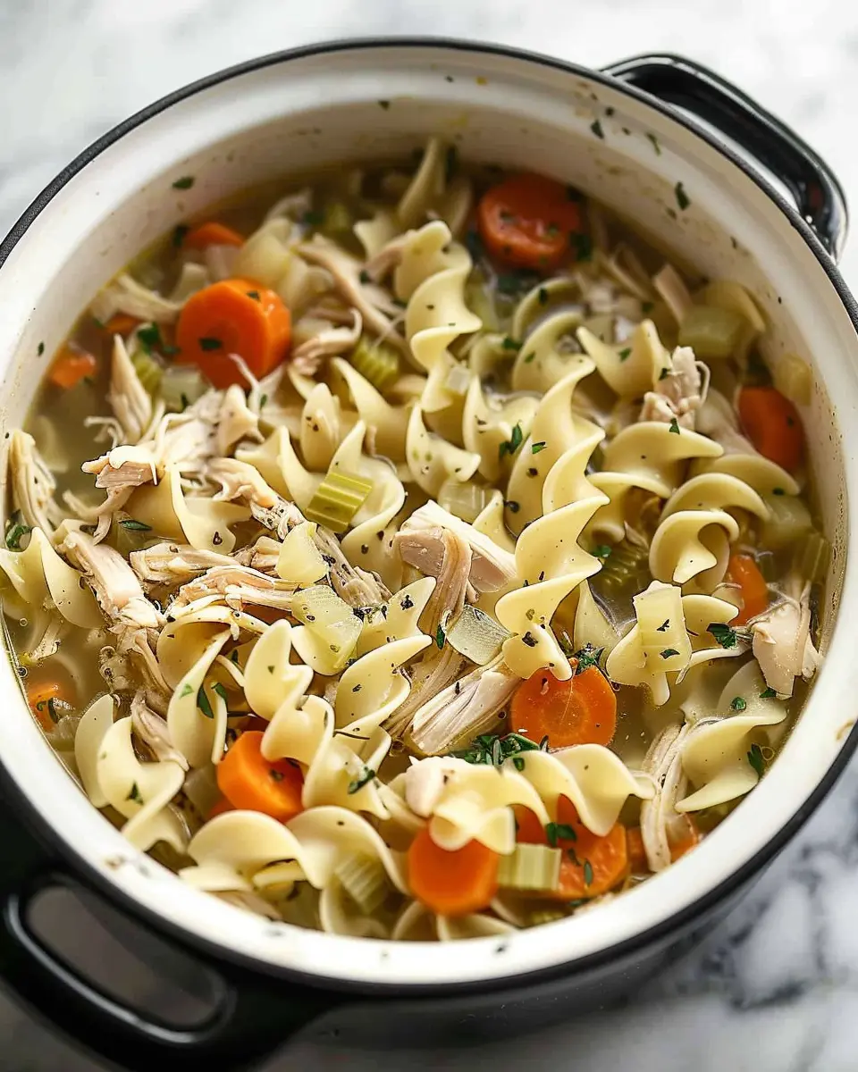 Here’s where things get exciting: add in your choice of noodles. Egg noodles are a classic for chicken noodle soup, but other options like whole wheat or gluten-free noodles work beautifully too. Cook the noodles according to the package instructions, then toss them in the slow cooker about 30 minutes before serving.