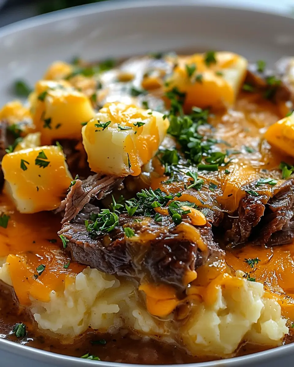 A comforting and easy dish made in a slow cooker, featuring steak and cheddar potatoes.