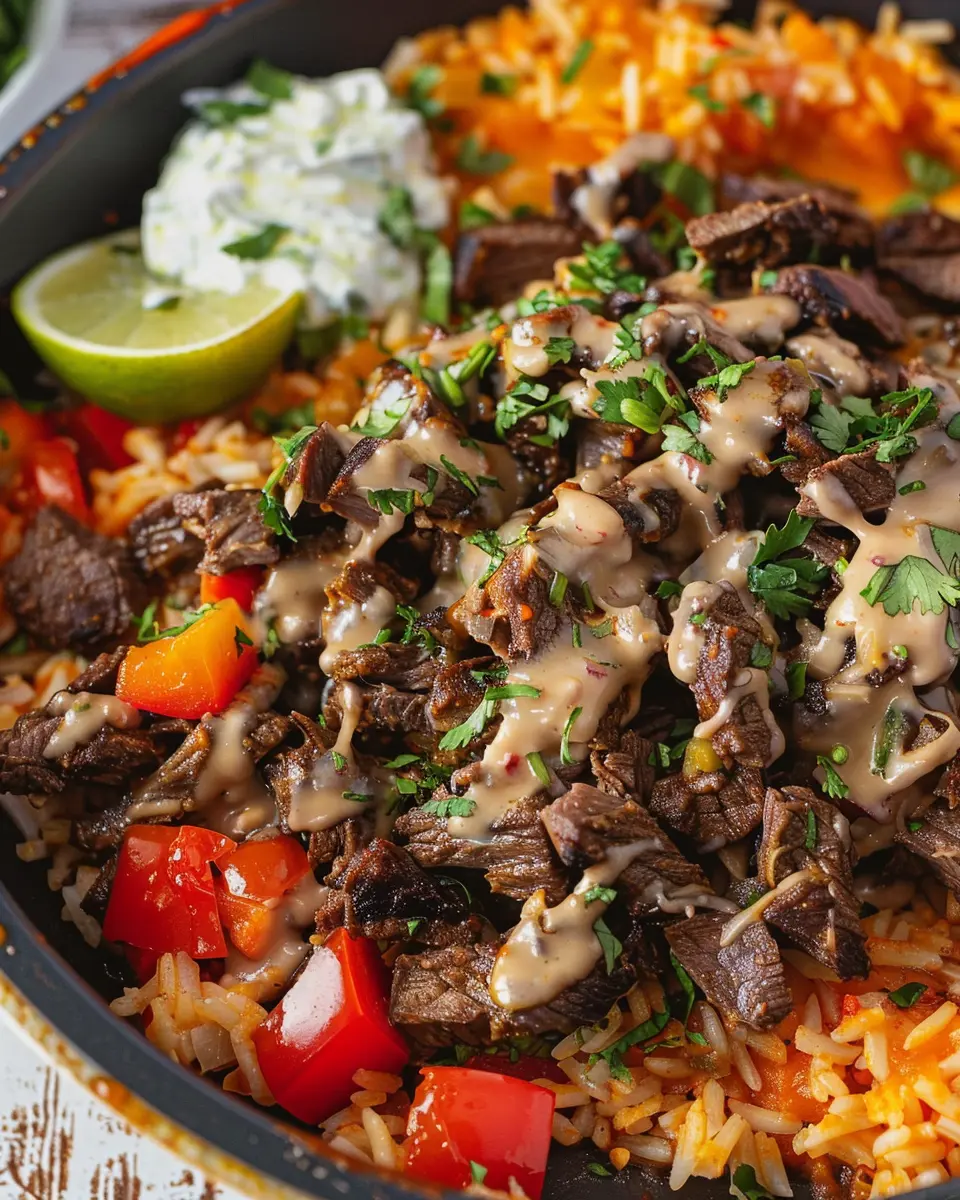 Now for the grand reveal! In a serving bowl, layer your seasoned rice, topped with the luscious queso and the tender steak pieces. Drizzle extra queso over the top if you’re feeling indulgent, and garnish with fresh cilantro for a pop of color and freshness.